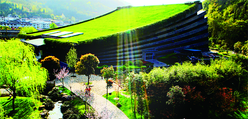 音樂廳與黃龍洞相毗鄰,背靠植被茂密的黃龍洞山體,面朝廣闊田園,南鄰潺潺東流的索溪水,音樂廳屋頂被綠蔭花草覆蓋,綠化面積達3000平方米,是我國目前最大的單體斜坡綠化屋頂,也是世界上唯一的一家生態(tài)劇院。音樂廳外墻由張家界青石頁巖構(gòu)建成的音符弦線幕墻與自然融合一體,如同一本即將展開等待世人閱讀的張家界文化寶典,又如鑲嵌在張家界的一塊翡翠。